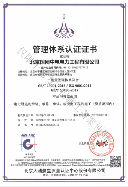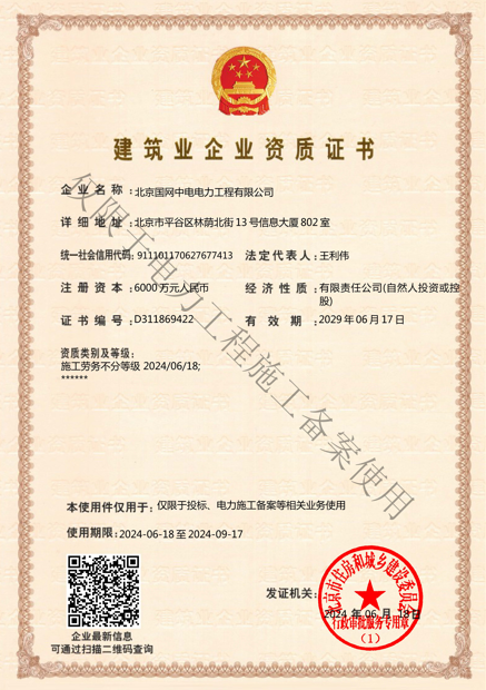 北京國網中電電力工程有限公司,已取得國家電監(jiān)會頒發(fā)的《承裝(修、試)電力設施許可證》、為電力施工承裝四級、承修四級、承試四級企業(yè)。北京市住房和城鄉建設委員會頒發(fā)的房屋建筑施工總承包二級、機電設備安裝工程專業(yè)承包二級、輸變電專業(yè)承包二級、城市及道路照明工程專業(yè)承包二級、市政公用工程總承包二級資質、勞務不分等級,已通過ISO9001:2015 GB/T50430-2017質量管理體系、GB/T24001-2016/ISO 14001:2015環(huán)境管理體系、
